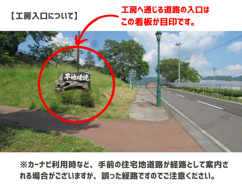 | アクセスについて | ◆アクセスについて(工房入口道路のご説明) ①国道396号線の「らーめんねぎみそ屋」の交差点を北東へ曲がります。 ②220mほど進んだところから、「早池峰焼」という木の看板が目印に赤茶色の舗装道路へ左折します。 ③100mほど1本道を進むと砂利舗装の駐車場と星工房がございます。 ※周辺の住宅道路に進入されないようご注意ください。 ※カーナビなどへ住所を直接入力する形ですと、正確な経路が案内されない場合があります。 |