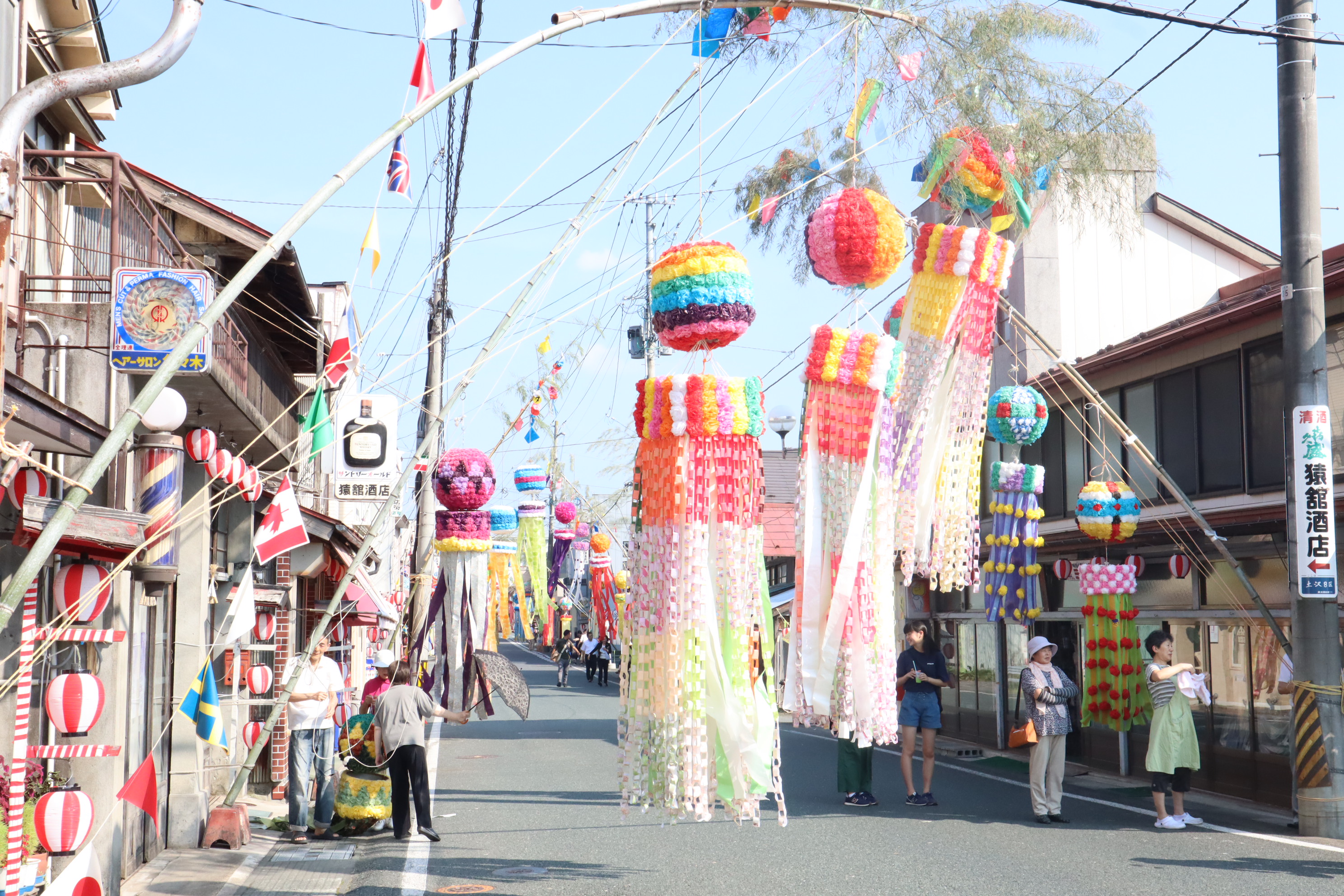 大正時代から続く伝統ある七夕まつりです。花巻市東和町土沢商店街をメイン会場として、約80本の竹に飾りつけられた色鮮やかな吹流しが商店街を埋め尽くします。七夕飾りの下に置かれた絵灯篭が、夜の七夕祭りを盛り上げます。