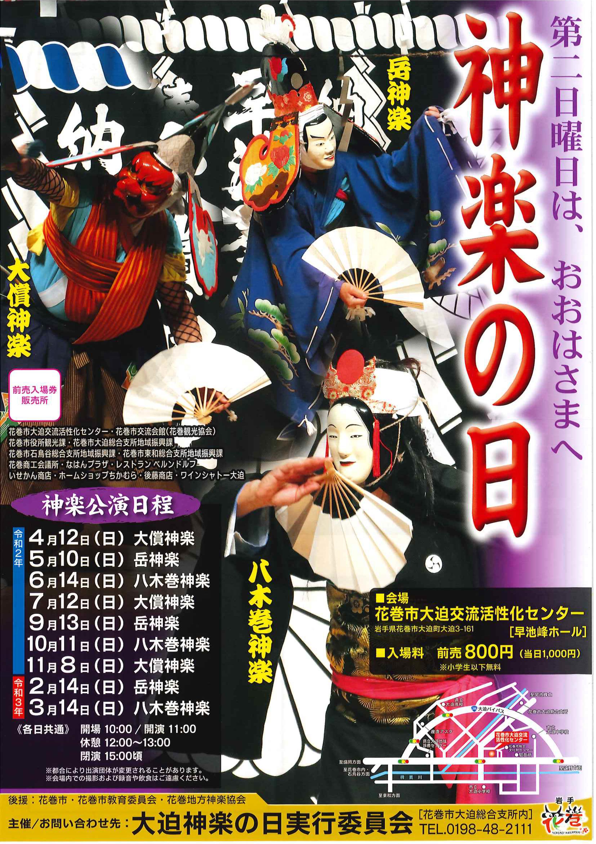 ユネスコの無形文化遺産「早池峰神楽」を間近で観ることができます! 毎月第2日曜日「神楽の日」には、花巻市大迫交流活性化センターを会場に、岳(たけ)神楽・大償(おおつぐない)神楽、八木巻(やきまき)神楽の3つが月替わりで公演します♪